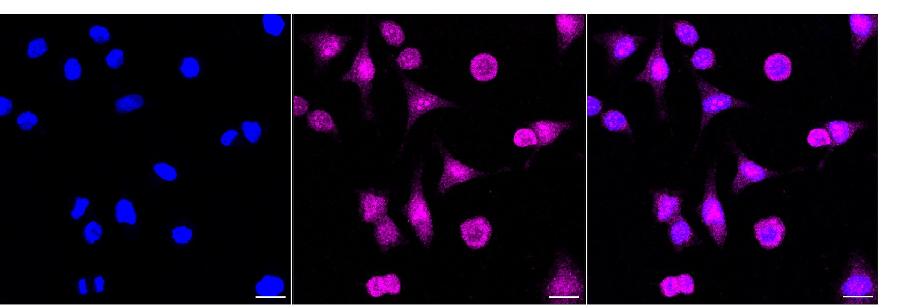 Immunocytochemical staining of Hela cells with Cystathionine beta-synthase antibody. Nuclei were stained blue with DAPI; Cystathionine beta-synthase?was stained magenta with Alexa Fluor? 647. Images were taken using Leica stellaris 5. Protein abundance based on laser Intensity and smart gain: Medium. Scale bar, 20 μm.