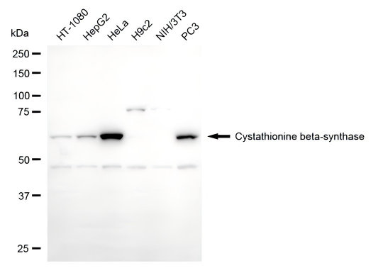 Western blotting analysis using cystathionine beta-synthase antibody. Total cell lysates (30 μg) from various cell lines were loaded and separated by SDS-PAGE. The blot was incubated with cystathionine beta-synthase antibody and HRP-conjugated goat anti-rabbit secondary antibody respectively.