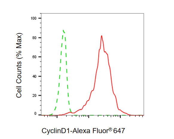 Flow cytometric analysis of Cyclin D1 expression in C2C12 cells using Cyclin D1 antibody. Green, isotype control; red, Cyclin D1.