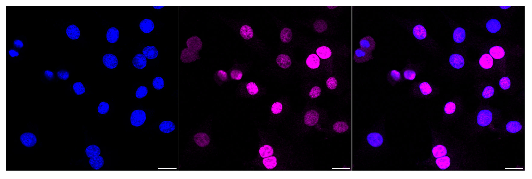 Immunocytochemical staining of C2C12 cells with Cyclin D1 antibody. Nuclei were stained blue with DAPI; Cyclin D1 was stained magenta with Alexa Fluor? 647. Images were taken using Leica stellaris 5. Protein abundance based on laser Intensity and smart gain: High. Scale bar, 20 μm.