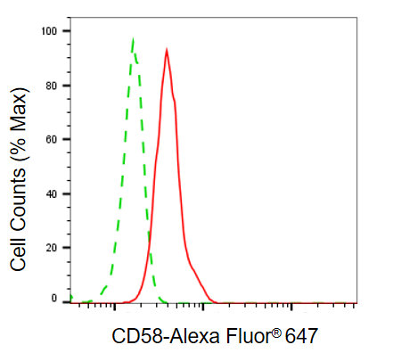Flow cytometric analysis of CD58 expression in HeLa cells using CD58 antibody. Green, isotype control; red, CD58.