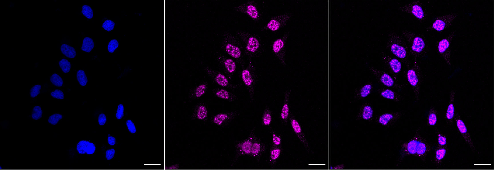 Immunocytochemical staining of Hela cells with CDC25C antibody. Nuclei were stained blue with DAPI; CDC25C was stained magenta with Alexa Fluor? 647. Images were taken using Leica stellaris 5. Protein abundance based on laser Intensity and smart gain: Medium. Scale bar, 20 μm.