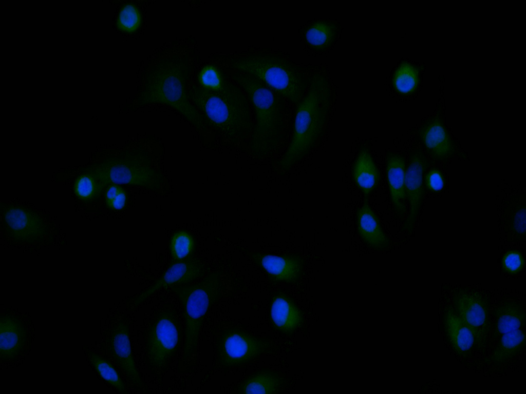 Immunofluorescence staining of A549 cell with CSB-RA199041A0HU at 1:50 , counter-stained with DAPI. The cells were fixed in 4% formaldehyde, permeabilized using 0.2% Triton X-100 and blocked in 10% normal Goat Serum. The cells were then incubated with the antibody overnight at 4°C. The secondary antibody was Alexa Fluor 488-congugated AffiniPure Goat Anti-Rabbit IgG(H+L).