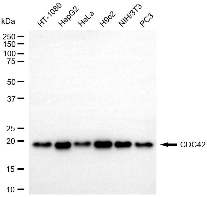 Western blotting analysis using CDC42 antibody. Total cell lysates (30 μg) from various cell lines were loaded and separated by SDS-PAGE. The blot was incubated with CDC42 antibody and HRP-conjugated goat anti-rabbit secondary antibody respectively.