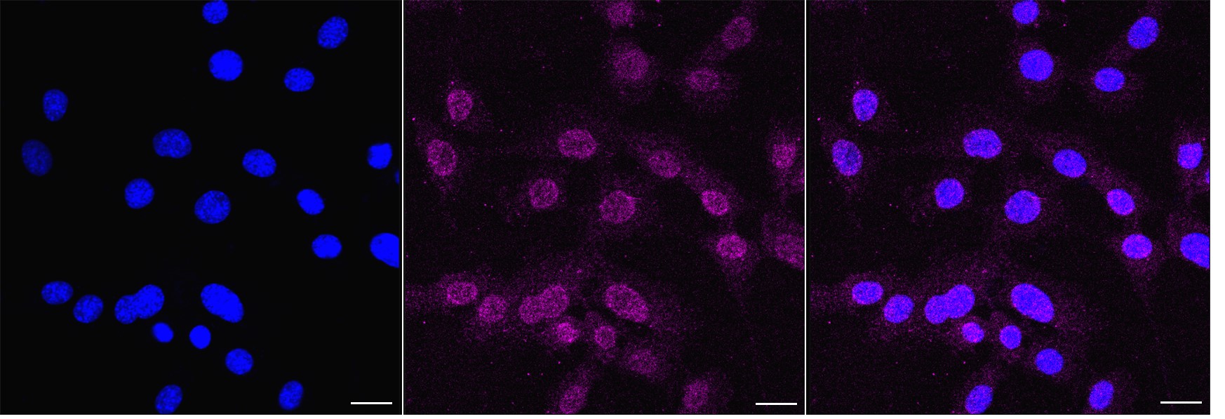 Immunocytochemical staining of C2C12 cells with CDC73 antibody. Nuclei were stained blue with DAPI; CDC73 was stained magenta with Alexa Fluor? 647. Images were taken using Leica stellaris 5. Protein abundance based on laser Intensity and smart gain: Low. Scale bar, 20 μm.