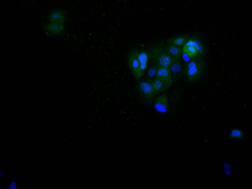 Immunofluorescence staining of A431 cell with CSB-RA172307A0HU at 1:50, counter-stained with DAPI. The cells were fixed in 4% formaldehyde, permeabilized using 0.2% Triton X-100 and blocked in 10% normal Goat Serum. The cells were then incubated with the antibody overnight at 4°C. The secondary antibody was Alexa Fluor 488-congugated AffiniPure Goat Anti-Rabbit IgG(H+L).
