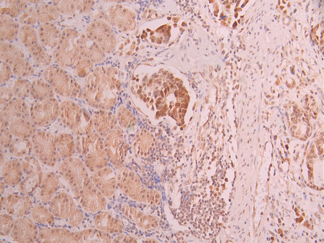 IHC image of CSB-RA172307A0HU diluted at 1:100 and staining in paraffin-embedded human gastric cancer performed on a Leica BondTM system. After dewaxing and hydration, antigen retrieval was mediated by high pressure in a citrate buffer (pH 6.0). Section was blocked with 10% normal goat serum 30min at RT. Then primary antibody (1% BSA) was incubated at 4°C overnight. The primary is detected by a Goat anti-rabbit polymer IgG labeled by HRP and visualized using 0.05% DAB.