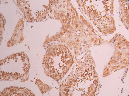 IHC image of CSB-RA172307A0HU diluted at 1:100 and staining in paraffin-embedded human testis tissue performed on a Leica BondTM system. After dewaxing and hydration, antigen retrieval was mediated by high pressure in a citrate buffer (pH 6.0). Section was blocked with 10% normal goat serum 30min at RT. Then primary antibody (1% BSA) was incubated at 4°C overnight. The primary is detected by a Goat anti-rabbit polymer IgG labeled by HRP and visualized using 0.05% DAB.