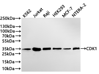 Positive WB detected in: K562 whole cell lysate(30μg), Jurkat whole cell lysate(30μg), Raji whole cell lysate(30μg), HEK293 whole cell lysate(30μg), MCF-7 whole cell lysate(30μg), NTERA-2 whole cell lysate(30μg)