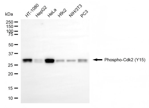 Western blotting analysis using phospho-Cdk2 (Y15) antibody. Total cell lysates (30 μg) from various cell lines were loaded and separated by SDS-PAGE. The blot was incubated with phospho-Cdk2 (Y15) antibody and HRP-conjugated goat anti-rabbit secondary antibody respectively.