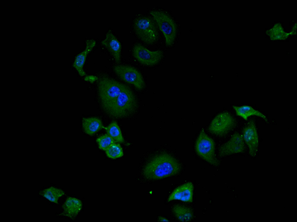 Immunofluorescence staining of Hela cell with CSB-RA914462A0HU at 1:50, counter-stained with DAPI. The cells were fixed in 4% formaldehyde, permeabilized using 0.2% Triton X-100 and blocked in 10% normal Goat Serum. The cells were then incubated with the antibody overnight at 4°C. The secondary antibody was Alexa Fluor 488-congugated AffiniPure Goat Anti-Rabbit IgG(H+L).