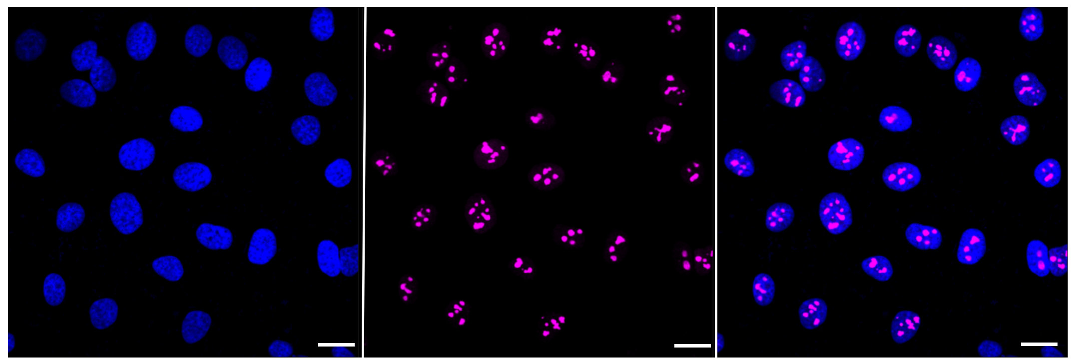 • Immunocytochemical staining of Hela cells with Cyclin dependent kinase inhibitor 2A antibody. Nuclei were stained blue with DAPI; Cyclin dependent kinase inhibitor 2A was stained magenta with Alexa Fluor? 647. Images were taken using Leica stellaris 5. Protein abundance based on laser Intensity and smart gain: High. Scale bar: 20 μm.