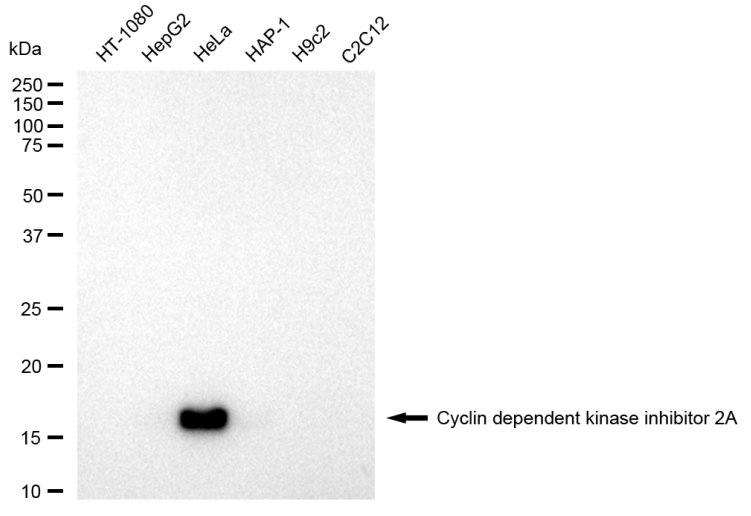 • Western blotting analysis using Cyclin dependent kinase inhibitor 2A antibody. Total cell lysates (30 μg) from various cell lines were loaded and separated by SDS-PAGE. The blot was incubated with Cyclin dependent kinase inhibitor 2A antibody and HRP-conjugated goat anti-rabbit secondary antibody respectively.