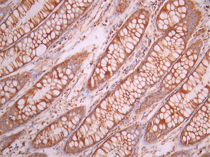 • IHC image of CSB-RA912925A0HU diluted at 1:100 and staining in paraffin-embedded human colorectal cancer performed on a Leica BondTM system. After dewaxing and hydration, antigen retrieval was mediated by high pressure in a citrate buffer (pH 6.0). Section was blocked with 10% normal goat serum 30min at RT. Then primary antibody (1% BSA) was incubated at 4°C overnight. The primary is detected by a Goat anti-rabbit polymer IgG labeled by HRP and visualized using 0.05% DAB.