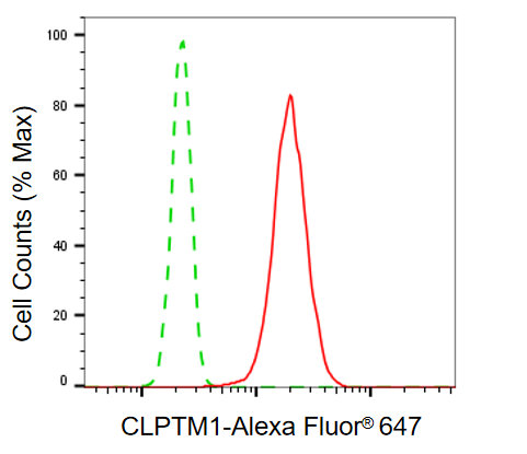 Flow cytometric analysis of CLPTM1 expression in HT-1080 cells using CLPTM1 antibody. Green, isotype control; red, CLPTM1.