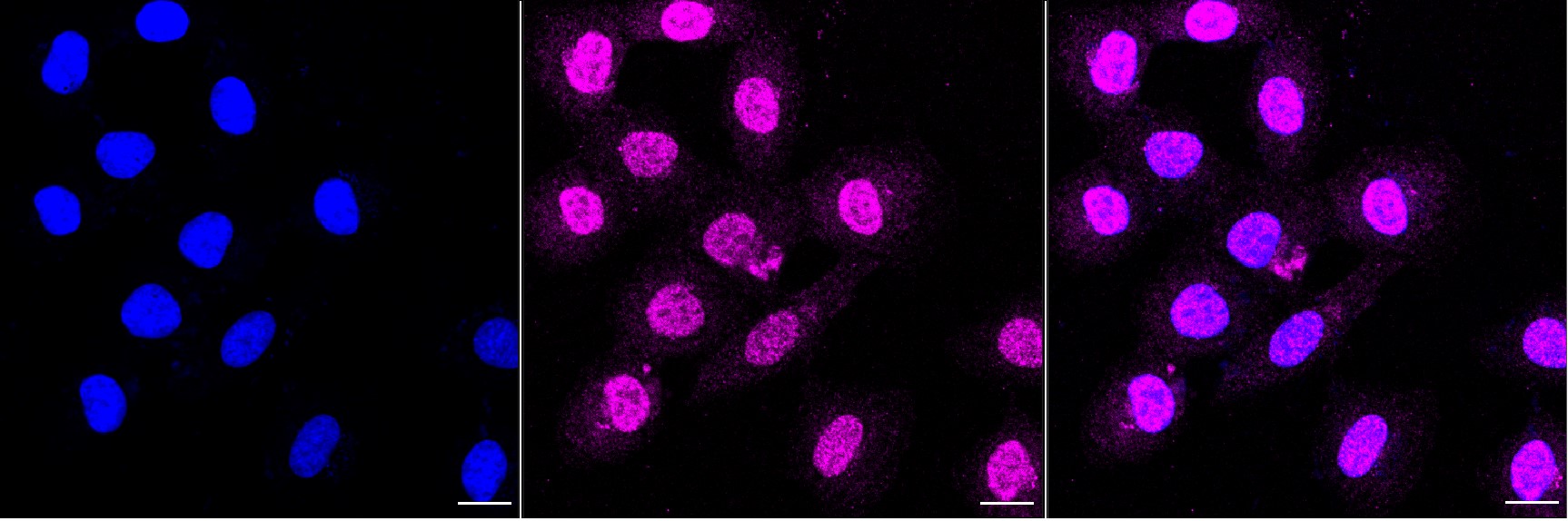 Immunocytochemical staining of HT-1080 cells with CLPTM1?antibody. Nuclei were stained blue with DAPI; CLPTM1 was stained magenta with Alexa Fluor? 647. Images were taken using Leica stellaris 5. Protein abundance based on laser Intensity and smart gain: Medium. Scale bar, 20 μm.