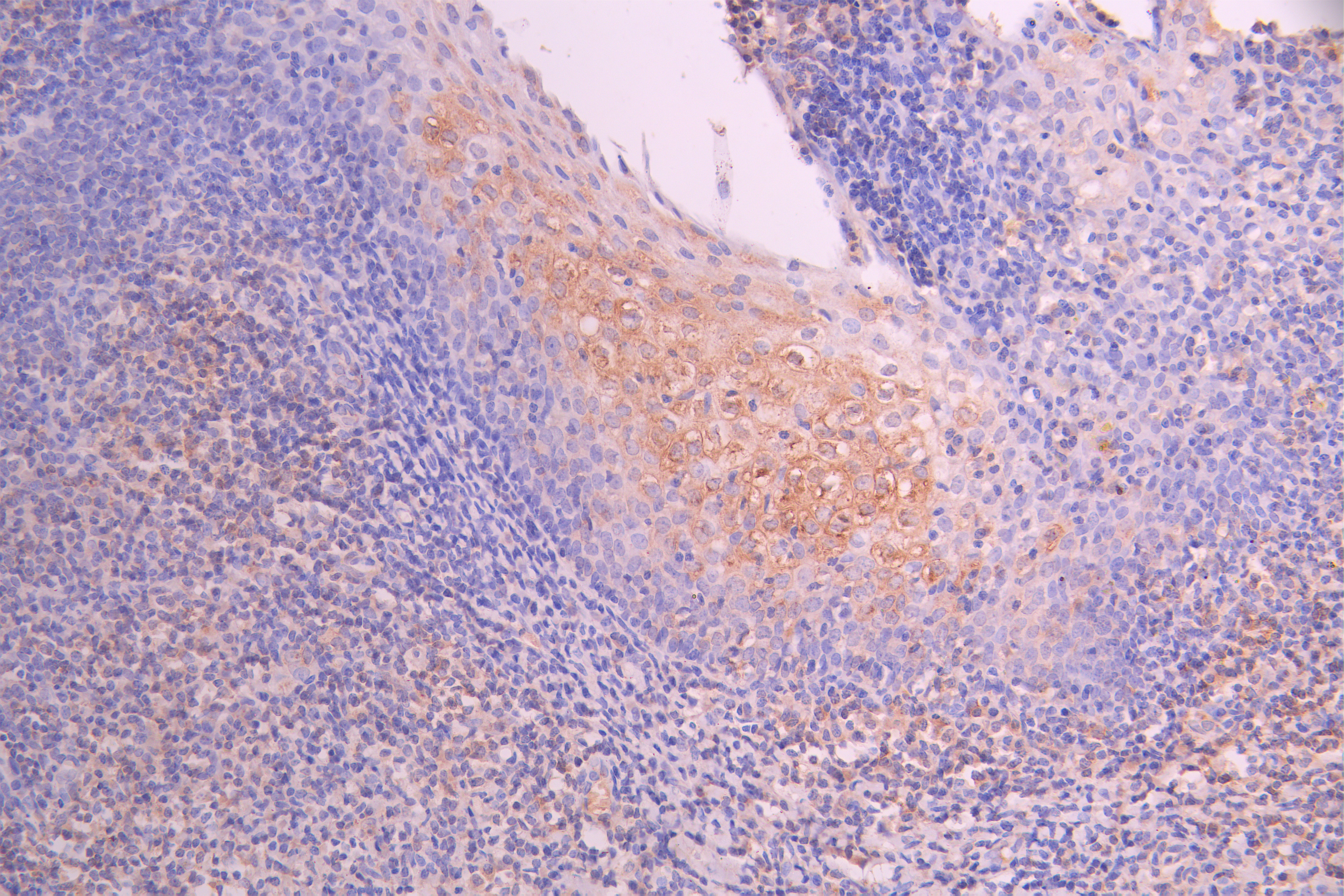 • IHC image of CSB-RA822164MA1HU diluted at 1:50 and staining in paraffin-embedded human tonsil tissue performed on a Leica BondTM system. After dewaxing and hydration, antigen retrieval was mediated by high pressure in a citrate buffer (pH 6.0). Section was blocked with 10% normal goat serum 30min at RT. Then primary antibody (1% BSA) was incubated at 4°C overnight. The primary is detected by a Anti-Human lgG, Fcy Fragment Specific labeled by HRP and visualized using 0.05% DAB.