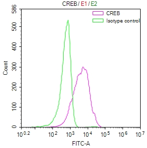 • Overlay Peak curve showing Jurkat cells stained with CSB-RA081853A0HU (red line) at 1:50. The cells were fixed in 4% formaldehyde and permeated by 0.2% TritonX-100. Then 10% normal goat serum to block non-specific protein-protein interactions followed by the antibody (1μg/1*106cells) for 45min at 4℃. The secondary antibody used was FITC-conjugated Goat Anti-rabbit IgG(H+L) at 1:200 dilution for 35min at 4℃.Control antibody (green line) was rabbit IgG (1μg/1*106cells) used under the same conditions. Acquisition of >10,000 events was performed.