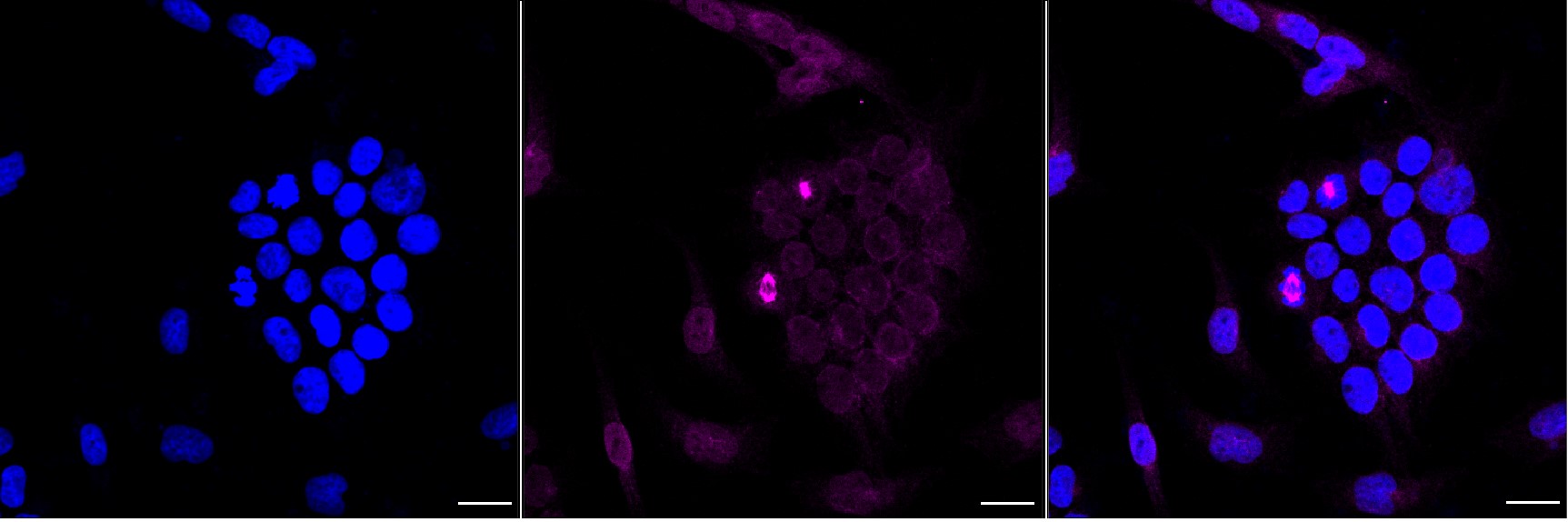Immunocytochemical staining of Hela cells with CSE1L antibody. Nuclei were stained blue with DAPI; CSE1L was stained magenta with Alexa Fluor? 647. Images were taken using Leica stellaris 5. Protein abundance based on laser Intensity and smart gain: High. Scale bar, 20 μm.