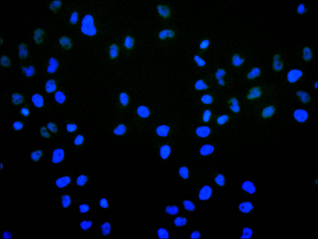 • Immunofluorescence staining of HeLa cell with CSB-RA257842A0HU at 1:50 , counter-stained with DAPI. The cells were fixed in 4% formaldehyde, permeabilized using 0.2% Triton X-100 and blocked in 10% normal Goat Serum. The cells were then incubated with the antibody overnight at 4°C. The secondary antibody was Alexa Fluor 488-congugated AffiniPure Goat Anti-Rabbit IgG(H+L).