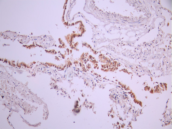 • IHC image of CSB-RA257842A0HU diluted at 1:100 and staining in paraffin-embedded human lung tissue performed on a Leica BondTM system. After dewaxing and hydration, antigen retrieval was mediated by high pressure in a citrate buffer (pH 6.0). Section was blocked with 10% normal goat serum 30min at RT. Then primary antibody (1% BSA) was incubated at 4°C overnight. The primary is detected by a Goat anti-rabbit polymer IgG labeled by HRP and visualized using 0.05% DAB.