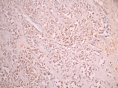 • IHC image of CSB-RA257842A0HU diluted at 1:100 and staining in paraffin-embedded human breast cancer performed on a Leica BondTM system. After dewaxing and hydration, antigen retrieval was mediated by high pressure in a citrate buffer (pH 6.0). Section was blocked with 10% normal goat serum 30min at RT. Then primary antibody (1% BSA) was incubated at 4°C overnight. The primary is detected by a Goat anti-rabbit polymer IgG labeled by HRP and visualized using 0.05% DAB.