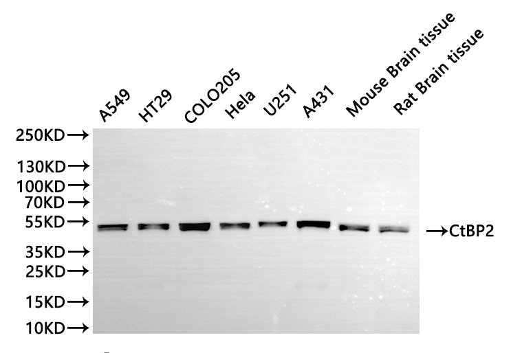 , Positive WB detected in:A549 whole cell lysate(30μg), HT29 whole cell lysate(30μg), COLO205 whole cell lysate(30μg), HELA whole cell lysate(30μg), U251 whole cell lysate(30μg), A431 whole cell lysate(30μg), Mouse brain tissue lysate(30μg), Rat brain lysate(30μg)