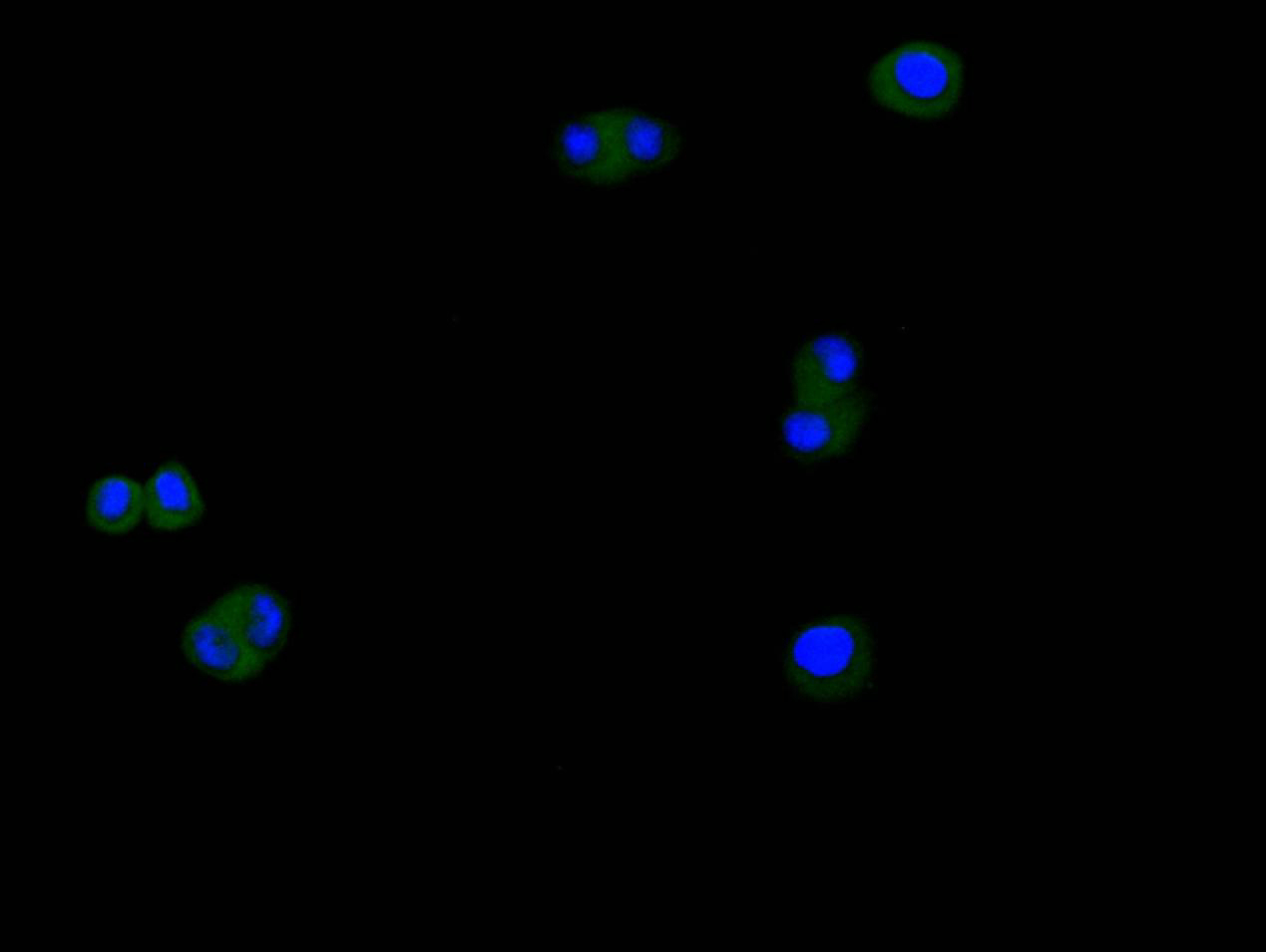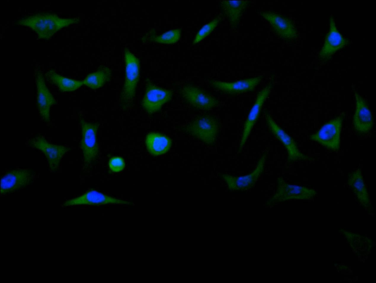 • Immunofluorescence staining of Hela cell with CSB-RA006169MA1HU at 1:200, counter-stained with DAPI. The cells were fixed in 4% formaldehyde and blocked in 10% normal Goat Serum. The cells were then incubated with the antibody overnight at 4C. The secondary antibody was Alexa Fluor 488-congugated AffiniPure Goat Anti-rabbit IgG(H+L).