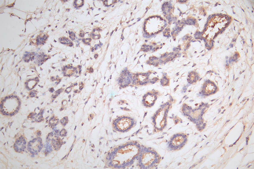• IHC image of CSB-RA006169MA1HU diluted at 1:100 and staining in paraffin-embedded human breast tissue performed on a Leica BondTM system. After dewaxing and hydration, antigen retrieval was mediated by high pressure in a citrate buffer (pH 6.0). Section was blocked with 10% normal goat serum 30min at RT. Then primary antibody (1% BSA) was incubated at 4°C overnight. The primary is detected by a Goat anti-rabbit polymer IgG labeled by HRP and visualized using 0.05% DAB.