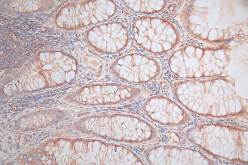 • IHC image of CSB-RA006169MA1HU diluted at 1:100 and staining in paraffin-embedded human rectal cancer performed on a Leica BondTM system. After dewaxing and hydration, antigen retrieval was mediated by high pressure in a citrate buffer (pH 6.0). Section was blocked with 10% normal goat serum 30min at RT. Then primary antibody (1% BSA) was incubated at 4°C overnight. The primary is detected by a Goat anti-rabbit polymer IgG labeled by HRP and visualized using 0.05% DAB.