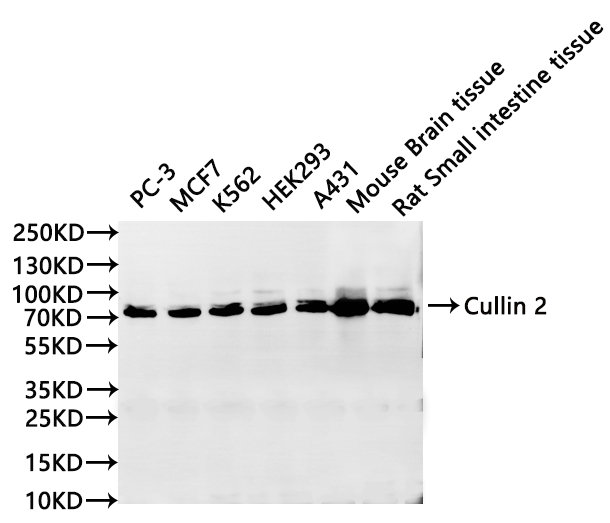 , Positive WB detected in:PC-3 whole cell lysate(30μg), MCF7 whole cell lysate(30μg), K562 whole cell lysate(30μg), HEK293 whole cell lysate(30μg), A431 whole cell lysate(30μg), Mouse brain tissue lysate(30μg), Rat Small intestine lysate(30μg)