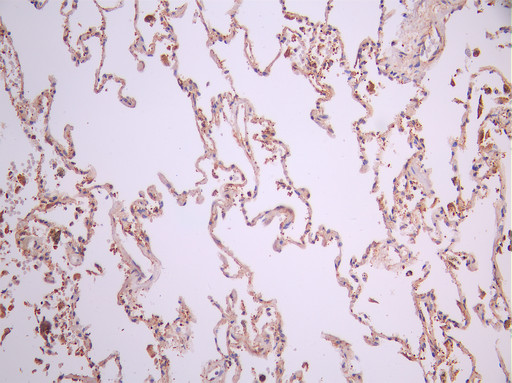 • IHC image of CSB-RA869286A0HU diluted at 1:100 and staining in paraffin-embedded human lung tissue performed on a Leica BondTM system. After dewaxing and hydration, antigen retrieval was mediated by high pressure in a citrate buffer (pH 6.0). Section was blocked with 10% normal goat serum 30min at RT. Then primary antibody (1% BSA) was incubated at 4°C overnight. The primary is detected by a Goat anti-rabbit polymer IgG labeled by HRP and visualized using 0.05% DAB.