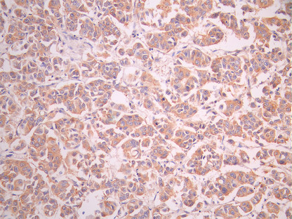 • IHC image of CSB-RA869286A0HU diluted at 1:100 and staining in paraffin-embedded human breast cancer performed on a Leica BondTM system. After dewaxing and hydration, antigen retrieval was mediated by high pressure in a citrate buffer (pH 6.0). Section was blocked with 10% normal goat serum 30min at RT. Then primary antibody (1% BSA) was incubated at 4°C overnight. The primary is detected by a Goat anti-rabbit polymer IgG labeled by HRP and visualized using 0.05% DAB.