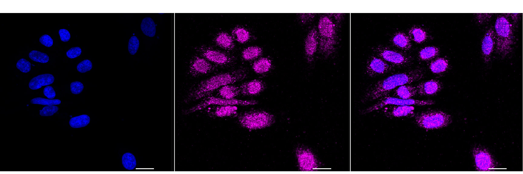 Immunocytochemical staining of HepG2 cells with Daxx antibody. Nuclei were stained blue with DAPI; Daxx was stained magenta with Alexa Fluor? 647. Images were taken using Leica stellaris 5. Protein abundance based on laser Intensity and smart gain: Medium. Scale bar, 20 μm.