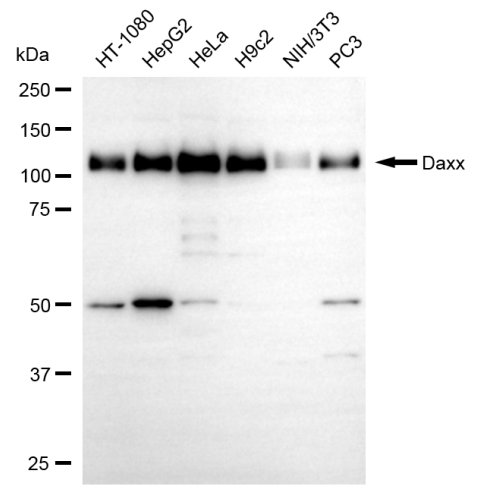Western blotting analysis using Daxx antibody. Total cell lysates (30 μg) from various cell lines were loaded and separated by SDS-PAGE. The blot was incubated with Daxx antibody and HRP-conjugated goat anti-rabbit secondary antibody respectively.