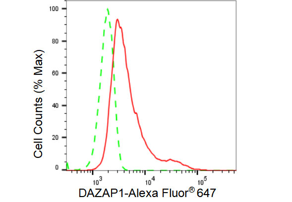 Flow cytometric analysis of DAZAP1 expression in HeLa cells using DAZAP1 antibody. Green, isotype control; red, DAZAP1.
