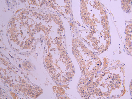 IHC image of CSB-RA006576MA1HU diluted at 1:50 and staining in paraffin-embedded human testis tissue performed on a Leica BondTM system. After dewaxing and hydration, antigen retrieval was mediated by high pressure in a citrate buffer (pH 6.0). Section was blocked with 10% normal goat serum 30min at RT. Then primary antibody (1% BSA) was incubated at 4°C overnight. The primary is detected by a Anti-Human lgG, Fcy Fragment Specific labeled by HRP and visualized using 0.05% DAB.