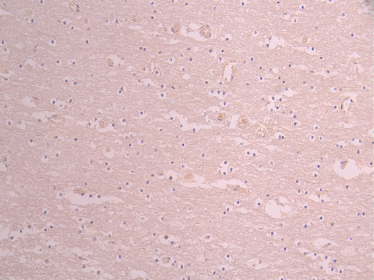 IHC image of CSB-RA006576MA1HU diluted at 1:50 and staining in paraffin-embedded human brain tissue performed on a Leica BondTM system. After dewaxing and hydration, antigen retrieval was mediated by high pressure in a citrate buffer (pH 6.0). Section was blocked with 10% normal goat serum 30min at RT. Then primary antibody (1% BSA) was incubated at 4°C overnight. The primary is detected by a Anti-Human lgG, Fcy Fragment Specific labeled by HRP and visualized using 0.05% DAB.