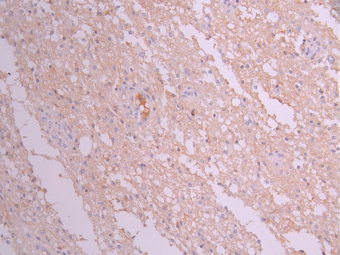 IHC image of CSB-RA006576MA1HU diluted at 1:50 and staining in paraffin-embedded human glioma cancer performed on a Leica BondTM system. After dewaxing and hydration, antigen retrieval was mediated by high pressure in a citrate buffer (pH 6.0). Section was blocked with 10% normal goat serum 30min at RT. Then primary antibody (1% BSA) was incubated at 4°C overnight. The primary is detected by a Anti-Human lgG, Fcy Fragment Specific labeled by HRP and visualized using 0.05% DAB.