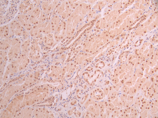 IHC image of CSB-RA066000A0HU diluted at 1:100 and staining in paraffin-embedded human kidney tissue performed on a Leica BondTM system. After dewaxing and hydration, antigen retrieval was mediated by high pressure in a citrate buffer (pH 6.0). Section was blocked with 10% normal goat serum 30min at RT. Then primary antibody (1% BSA) was incubated at 4°C overnight. The primary is detected by a Goat anti-rabbit polymer IgG labeled by HRP and visualized using 0.05% DAB.