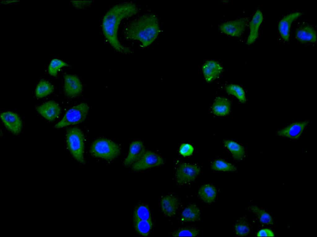 Immunofluorescence staining of Hela cell with CSB-RA209536A0HU at 1:50, counter-stained with DAPI. The cells were fixed in 4% formaldehyde, permeabilized using 0.2% Triton X-100 and blocked in 10% normal Goat Serum. The cells were then incubated with the antibody overnight at 4°C. The secondary antibody was Alexa Fluor 488-congugated AffiniPure Goat Anti-Rabbit IgG(H+L).