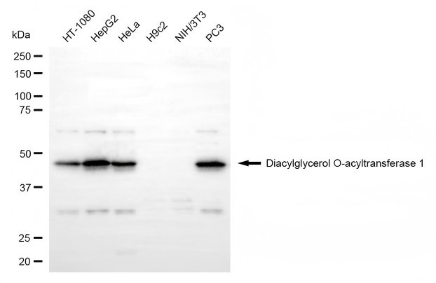 Western blotting analysis using diacylglycerol O-acyltransferase 1 antibody. Total cell lysates (30 μg) from various cell lines were loaded and separated by SDS-PAGE. The blot was incubated with diacylglycerol O-acyltransferase 1 antibody and HRP-conjugated goat anti-rabbit secondary antibody respectively.