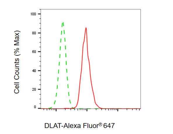 Flow cytometric analysis of DLAT expression in HepG2 cells using DLAT antibody. Green, isotype control; red, DLAT.