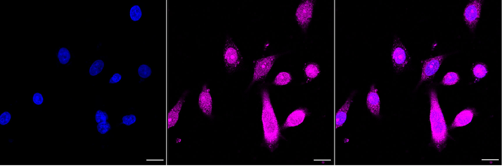 Immunocytochemical staining of HepG2 cells with DLAT Antibody antibody. Nuclei were stained blue with DAPI; DLAT Antibody was stained magenta with Alexa Fluor? 647. Images were taken using Leica stellaris 5. Protein abundance based on laser Intensity and smart gain: High. Scale bar, 20 μm.