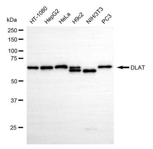 Western blotting analysis using DLAT antibody. Total cell lysates (30 μg) from various cell lines were loaded and separated by SDS-PAGE. The blot was incubated with DLAT antibody and HRP-conjugated goat anti-rabbit secondary antibody respectively.