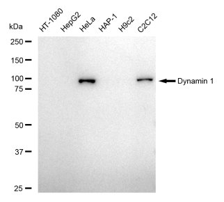 Western blotting analysis using Dynamin 1 antibody. Total cell lysates (30 μg) from various cell lines were loaded and separated by SDS-PAGE. The blot was incubated with Dynamin 1 antibody and HRP-conjugated goat anti-rabbit secondary antibody respectively.
