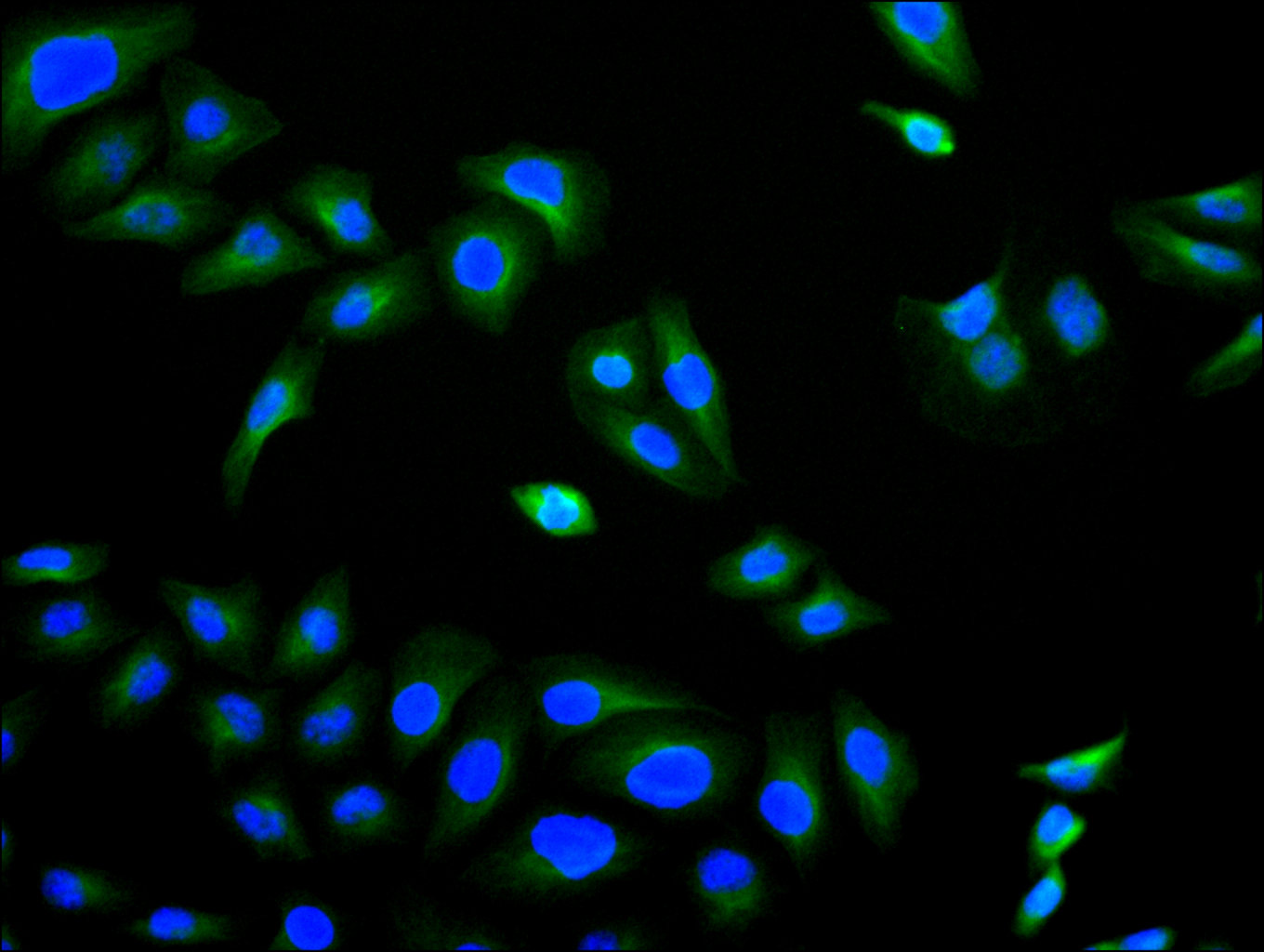 Immunofluorescence staining of HepG2 cell with CSB-RA897314MA1HU at 1:30 ,counter-stained with DAPI. The cells were fixed in 4% formaldehyde, permeabilized using 0.2% Triton X-100 and blocked in 10% normal Goat Serum. The cells were then incubated with the antibody overnight at 4°C. The secondary antibody was Fluorescein (FITC) AffiniPure Goat Anti-Human IgG, Fcγ fragment specific.