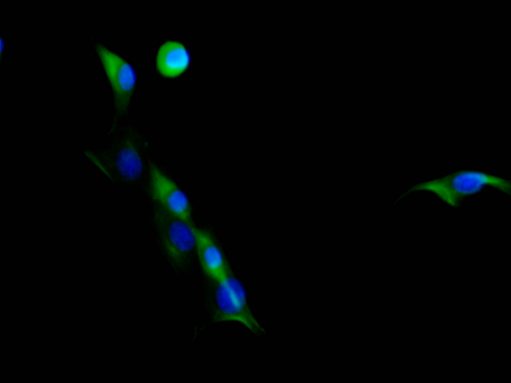 Immunofluorescence staining of NIH/3T3 cell with CSB-RA207310A0HU at 1:50 , counter-stained with DAPI. The cells were fixed in 4% formaldehyde, permeabilized using 0.2% Triton X-100 and blocked in 10% normal Goat Serum. The cells were then incubated with the antibody overnight at 4°C. The secondary antibody was Alexa Fluor 488-congugated AffiniPure Goat Anti-Rabbit IgG(H+L).