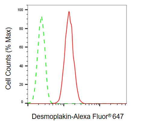 • Flow cytometric analysis of desmoplakin expression in HepG2 cells using desmoplakin antibody. Green, isotype control; red, desmoplakin.