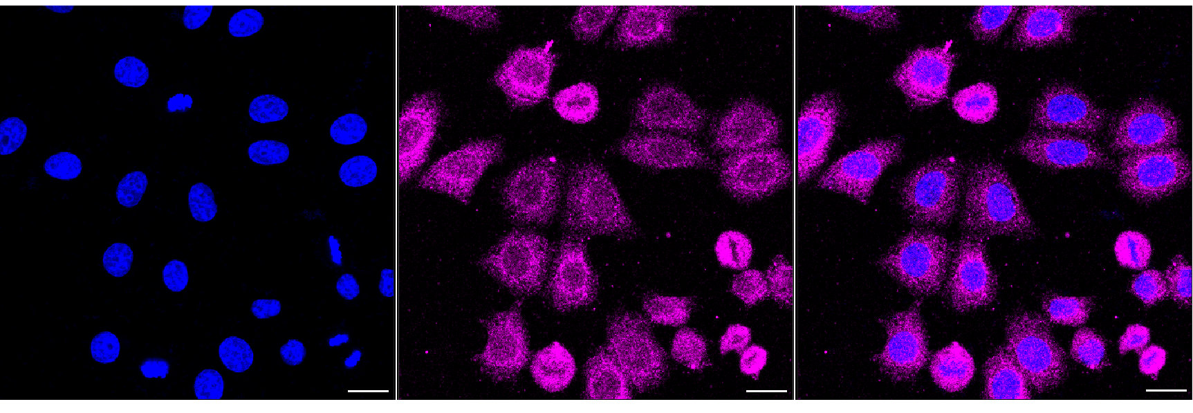 • Immunocytochemical staining of HepG2 cells with desmoplakin antibody. Nuclei were stained blue with DAPI; Desmoplakin was stained magenta with Alexa Fluor? 647. Images were taken using Leica stellaris 5. Protein abundance based on laser Intensity and smart gain: Low. Scale bar, 20 μm.